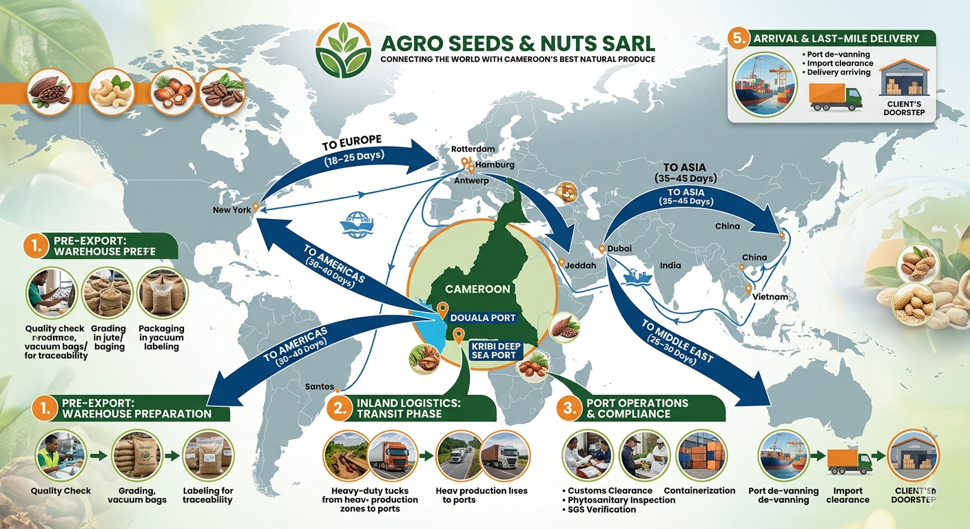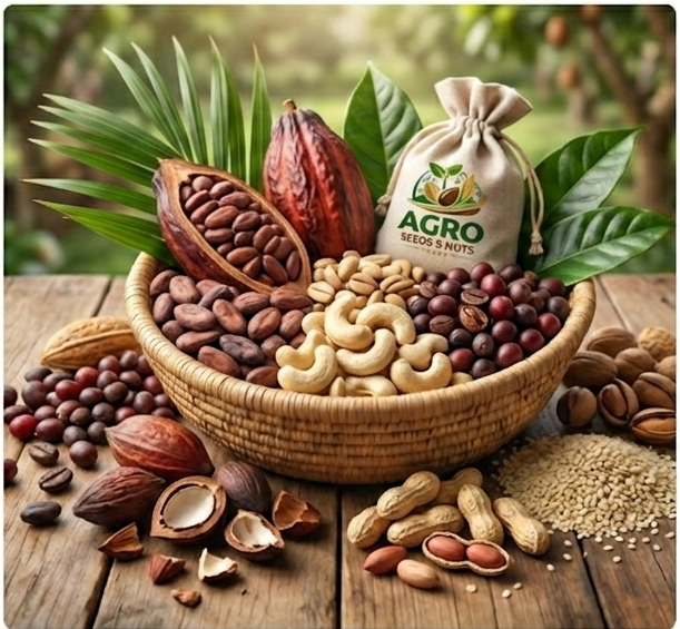 At AGRO SEEDS & NUTS SARL, we are a trusted Cameroonian exporter specializing in premium-quality agricultural products. Sourced directly from the rich farmlands of Cameroon, our range includes cocoa beans, cashew nuts, palm kernels, coffee beans, peanuts, sesame seeds, and a wide variety of high-grade seeds and nuts.